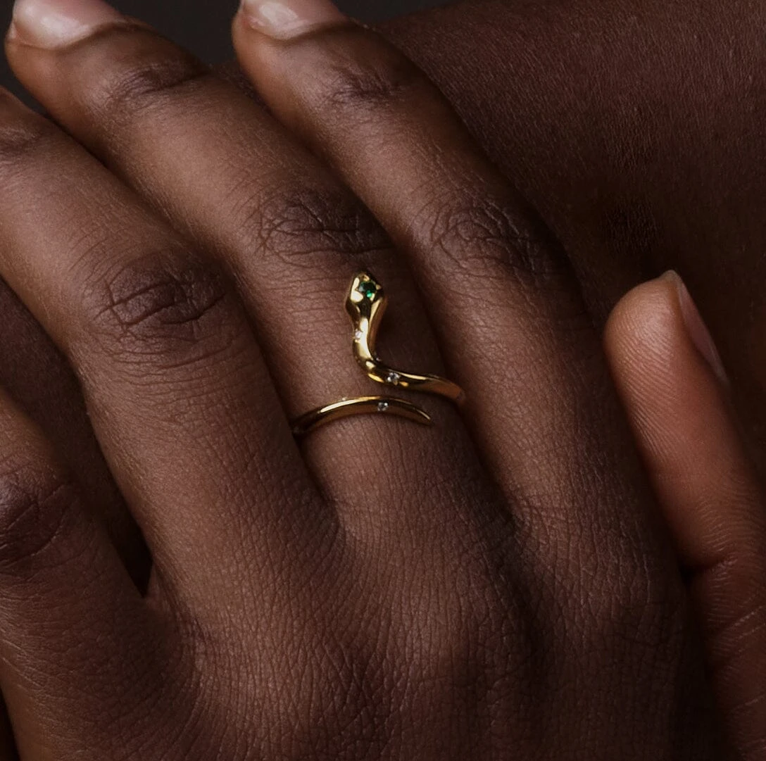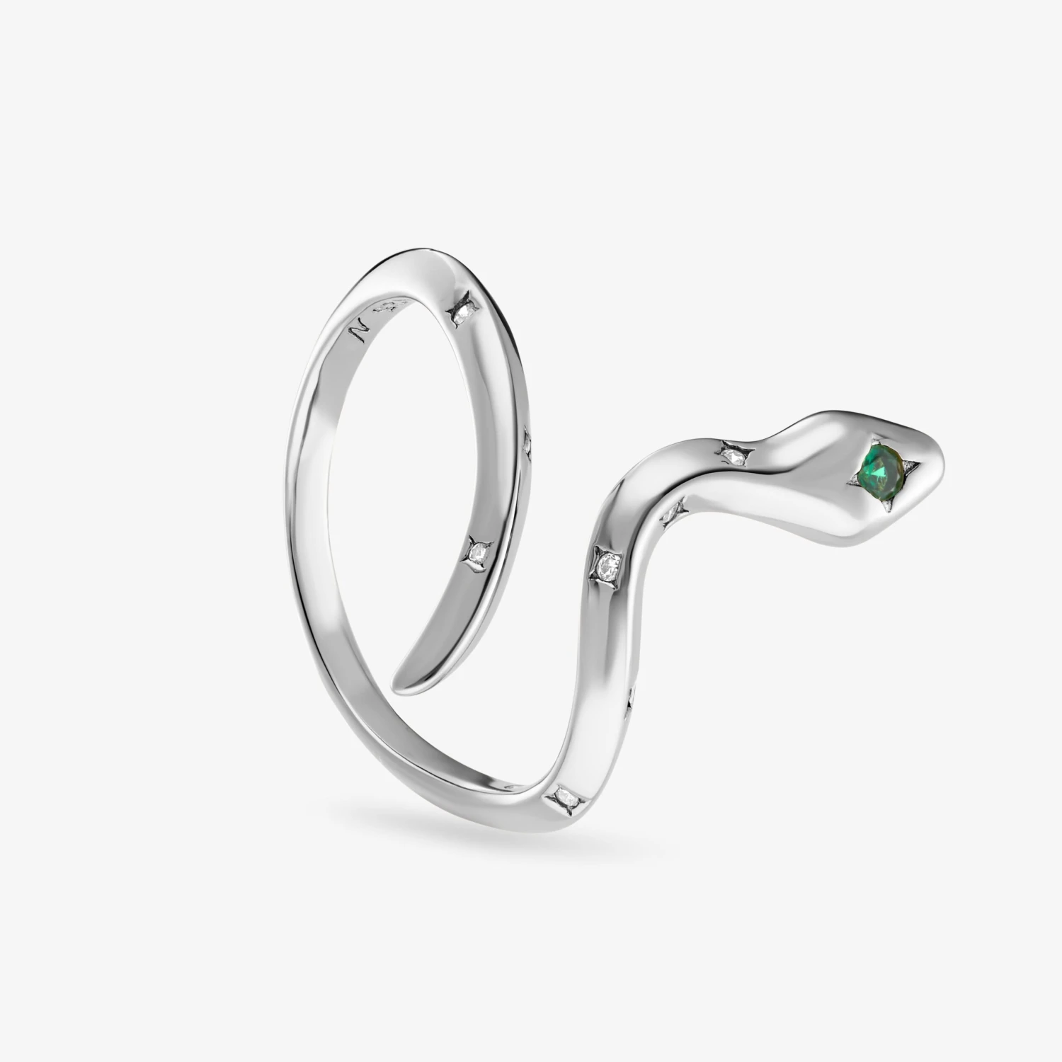 L’envoûtante bague Naja s’enlace autour de votre doigt. Sa peau est ornée de pierres zircon blanches et sur sa tête une pierre verte émeraude. 🐍