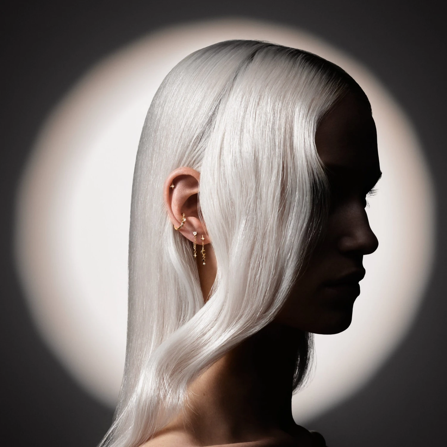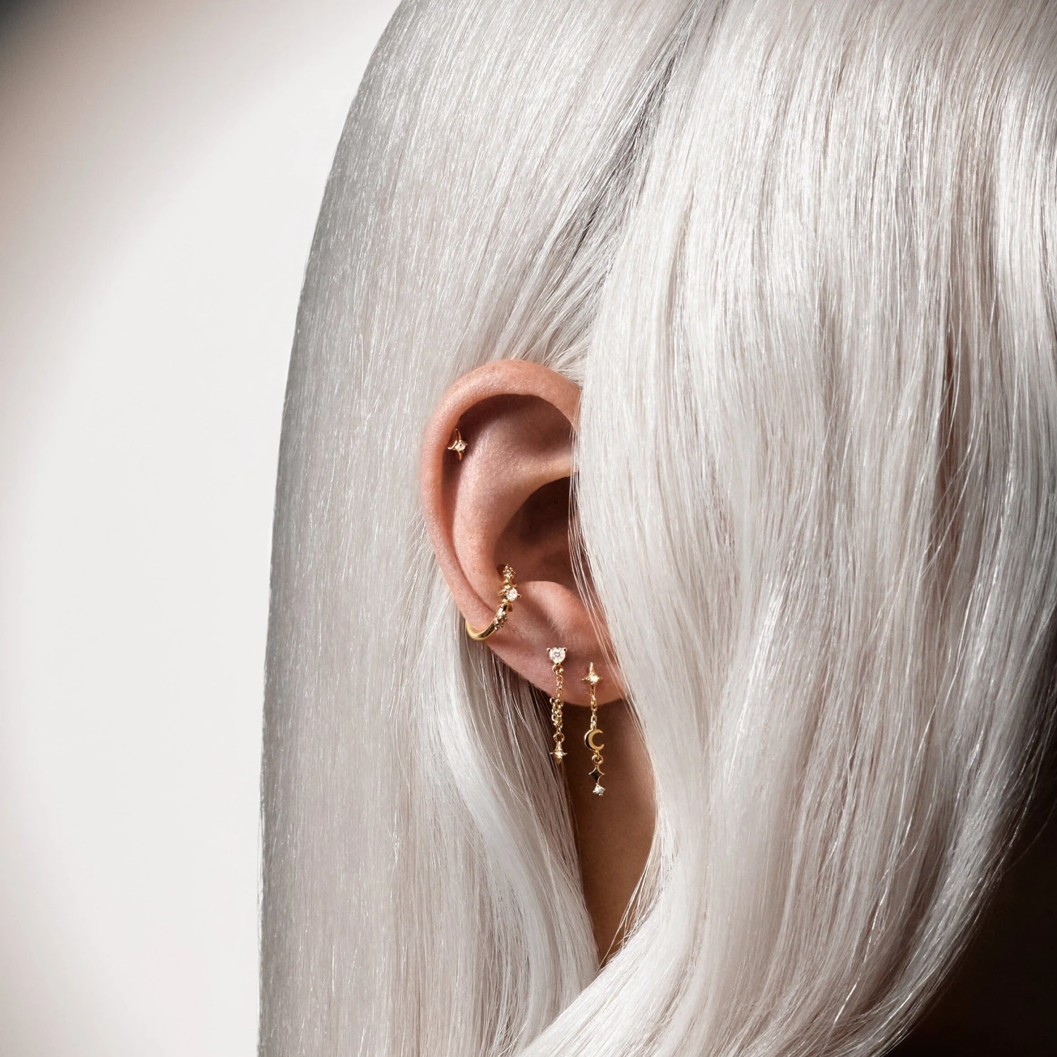 Puce d’oreille pendante accompagnée d’une étoile sertie d’une pierre de zircon blanche et d’une petite Lune. ✨