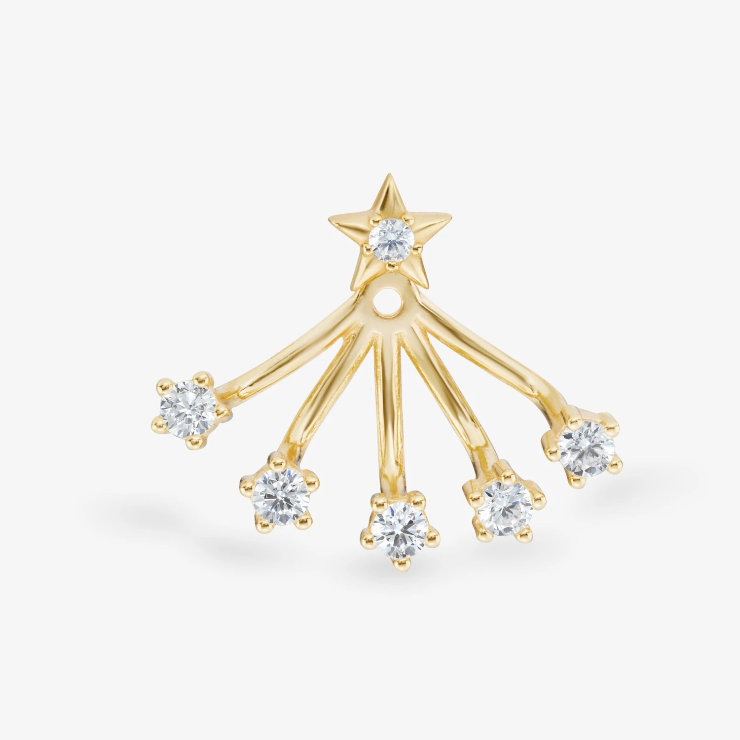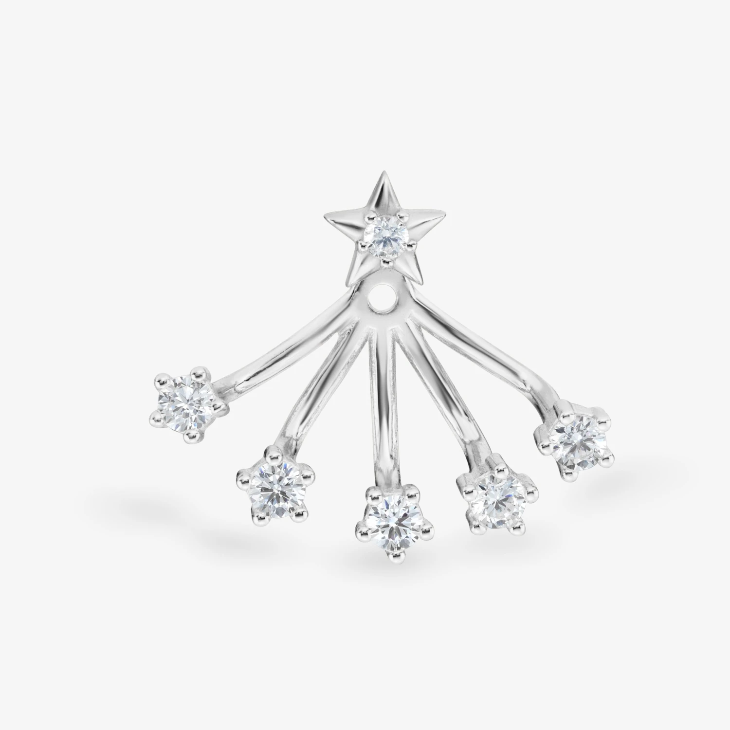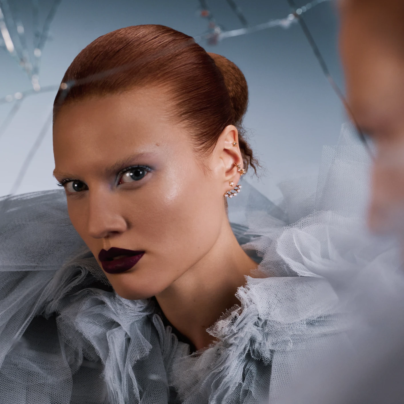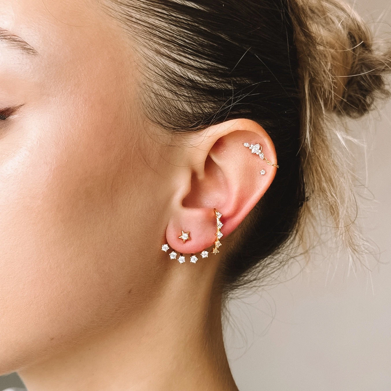 Vous aviez adoré la boucle Kim, voici Parade. Un bijou qui se place derrière le lobe, aux multiples zircons ronds. Elle est accompagnée d’une petite puce en forme d’étoile✨